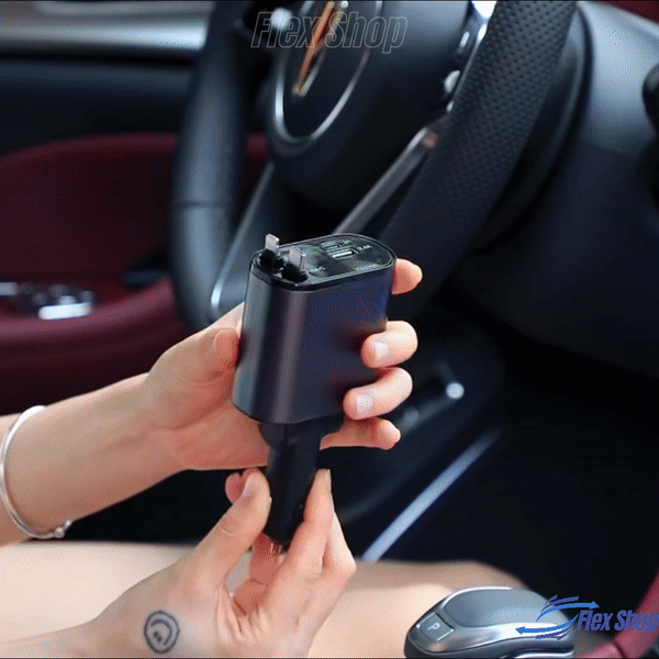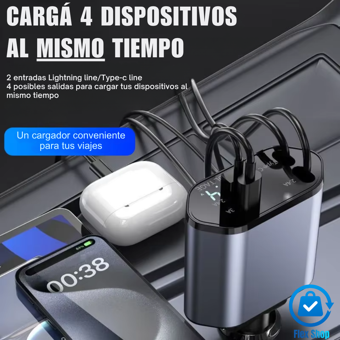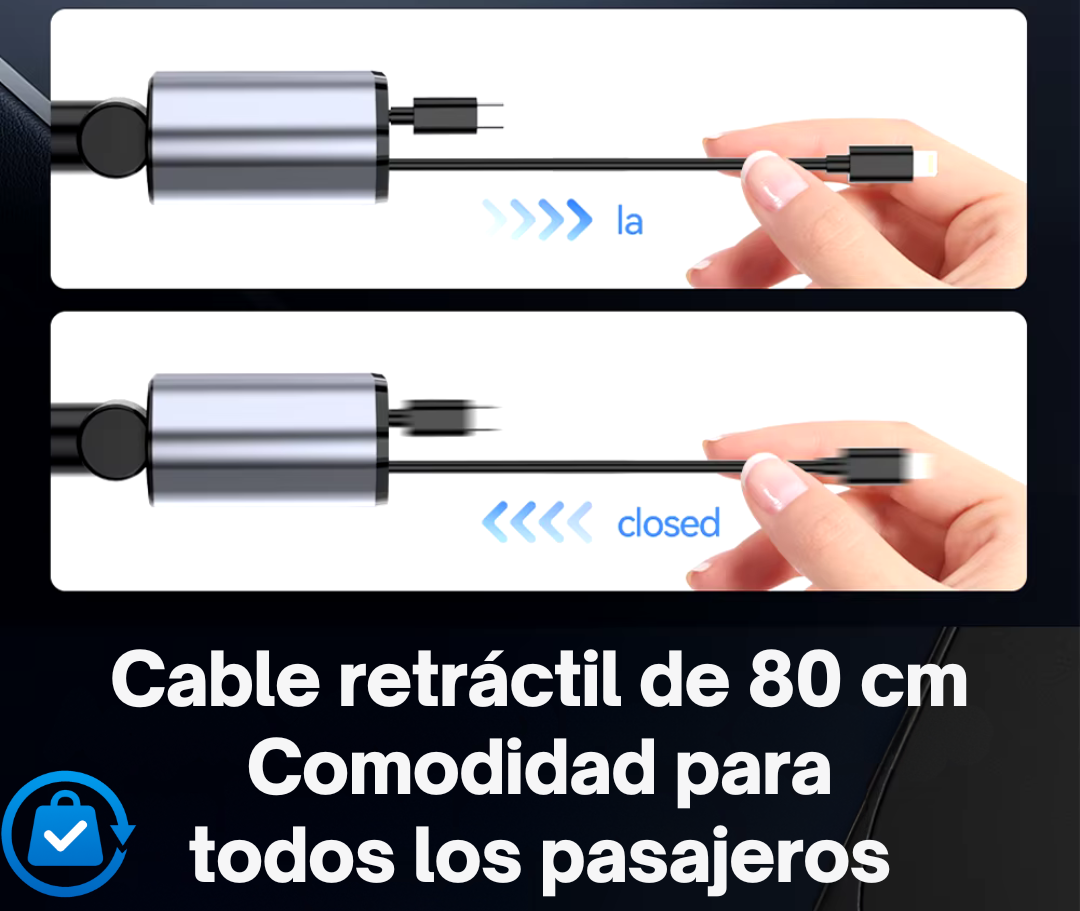 Ambas salidas de cables son retractiles, permite ahorrar espacio en cables y cargar comodamente a todos en el auto.